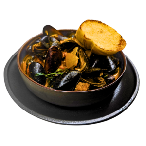 Negra Modelo beer braised PEI mussels, chorizo, onion, cilantro, tomatoes, chile negro & guajillo sauce, garlic bread.