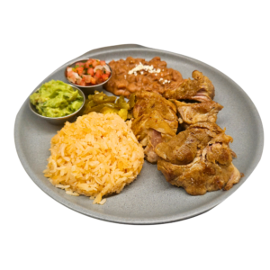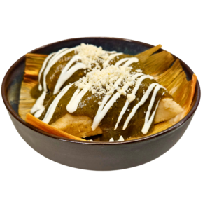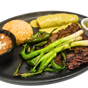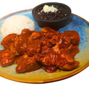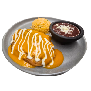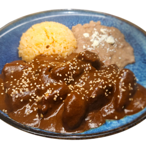 Soft corn tortillas filled with shredded chicken finished with Mole sauce, fresh cheese, sour cream, rice, pinto beans. Sauce contains,…