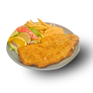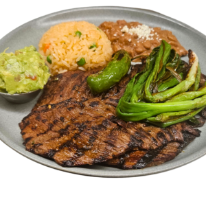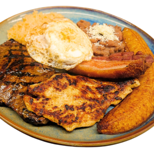 Grilled steak, grilled chicken breast, crispy pork belly (chicharron), fry plantain, fried eggs, rice and beans