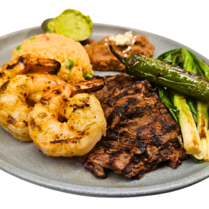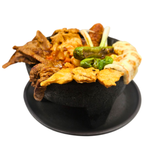 All grilled steak, chorizo, chicken, shrimp, pork chop, fry cheese, serrano peppers, scallions, pinto beans, rice, tortillas. For 2 people