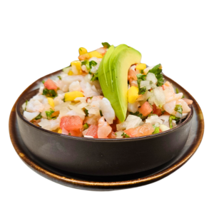 Shrimp ceviche prepared with lime juice, mango, cucumber, red onion, cilantro, serrano peppers, tomato, avocado. Served with tortilla chips.