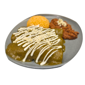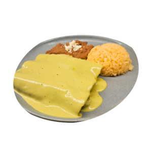 Soft corn tortillas filled with shredded chicken, finished with chihuahua cheese, Poblano Cream Sauce, rice, pinto beans.