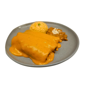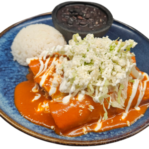 Soft corn tortillas filled with shredded chicken, white rice, black beans, finished with guajillo tomato sauce, shredded lettuce, fresh cheese,…