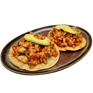 Two shrimp tostadas, prepared with chipotle sweet tomato broth, onion, cilantro, serrano peppers, tomato, avocado.
