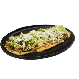 Corn masa ( flatbread ) layered with pinto beans purée, morita sauce. Topped with diced onion, cilantro, lettuce, sour cream,…