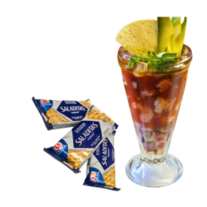Shrimp Cocktail prepared with sweet tomato broth, clam juice, onion, tomato, cilantro, serrano pepper, avocado. served with saltine crackers.