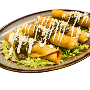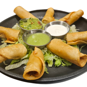 Rolled crispy mini corn tortillas filled with shredded chicken, Served with tomatillo salsa, sour cream, guacamole.