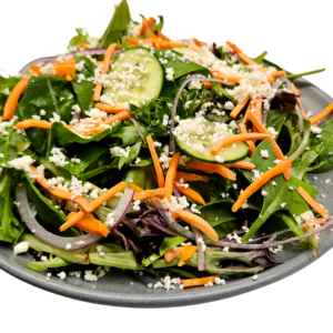 Mixed greens, carrots, tomato, red onion, cucumber, fresh cheese. Add chicken $6.00 – steak $7.00 – shrimp $9.00 – salmon…