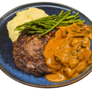 Grilled NEW YORK STEAK served with mash potatoes, asparagus, finished with salsa Mexicana with mushrooms.