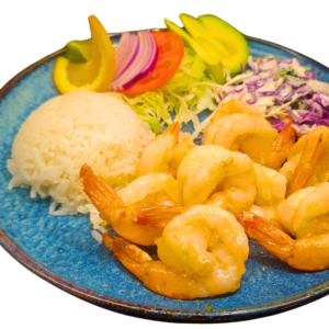 Sautéed shrimp with garlic sauce, white coconut jasmine rice, coleslaw, lettuce, red onion, tomato, avocado, garlic bread.