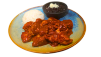chili sauce, white coconut jasmine rice, black beans, corn tortillas.