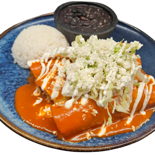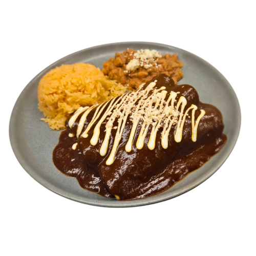 Soft corn tortillas filled with shredded chicken, finished with chihuahua cheese, Poblano Cream Sauce, rice, pinto beans.